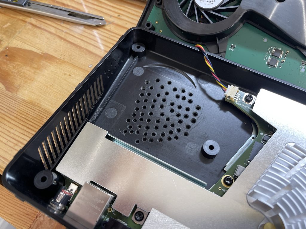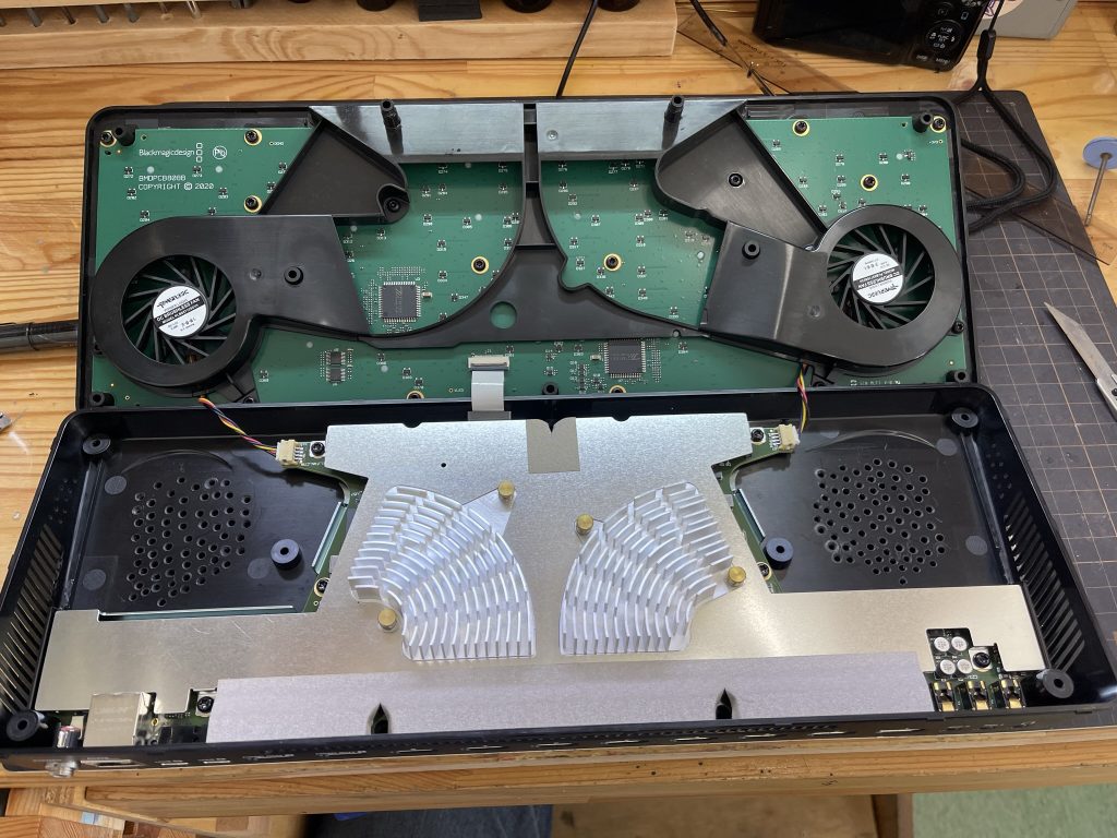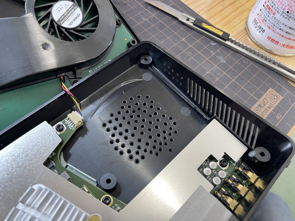 ATEMの熱問題についてですが、本体内にファンが2台付いており、通常側面からの吸気のみですが、ファンの直下から吸気できるように穴を開け、本体底部に硬質スポンジで、1センチ程度の隙間を設け、吸気できるようにしました。吸気性能を高めました。